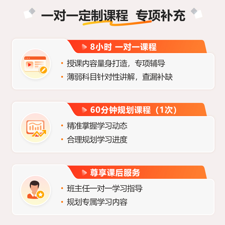 1对1定制课时通过1V1定制课时,补足英语基础或强化考试薄弱科目能力。