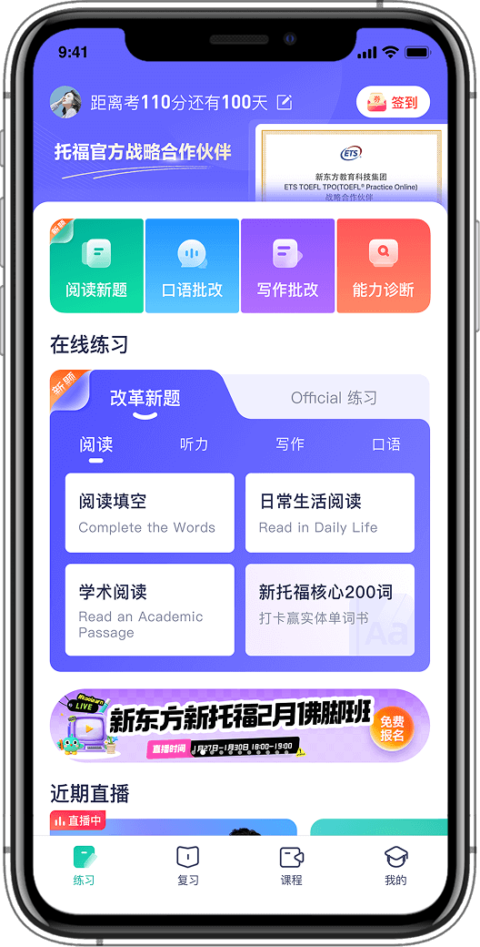 2026年1月起,托福考试全面改革,阅读听力采用自适应考试,并更新各科题型。基于新托福,App内配套新东方核心自研题目。